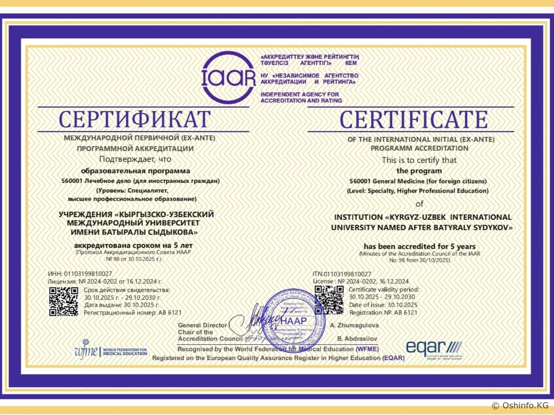 Маалыматка караганда, аталган билим берүү программасынын ишмердүүлүгүн баалоо WFMO, AMSE, ESG стандарттарынын негизинде жүргүзүлүп, IAAR агенттигинин Аккредитациялык кеңешинин 2025-жылдын 30-октябрындагы отурумунун №98 чечиминин негизинде университетке медициналык багыттагы адистерди даярдоо дүйнөлүк жана европалык талаптарга жооп бергендигин тастыктаган сертификат ыйгарылды. Аккредитациянын жыйынтык отчету эл аралык DEQAR маалымат базасына жүктөлүп, университеттин эл аралык билим берүү мейкиндигиндеги ордун бекемдеди.