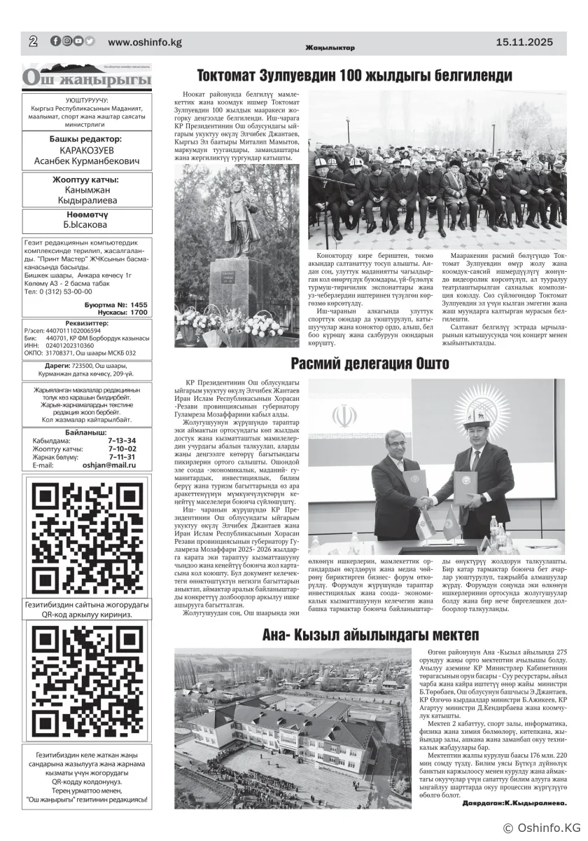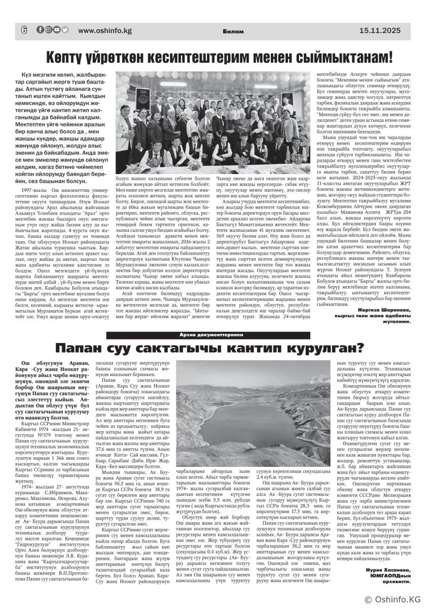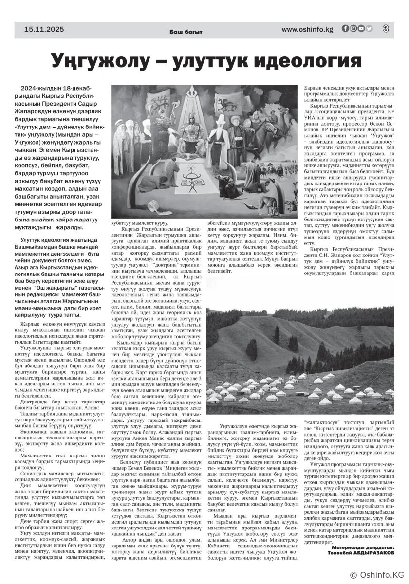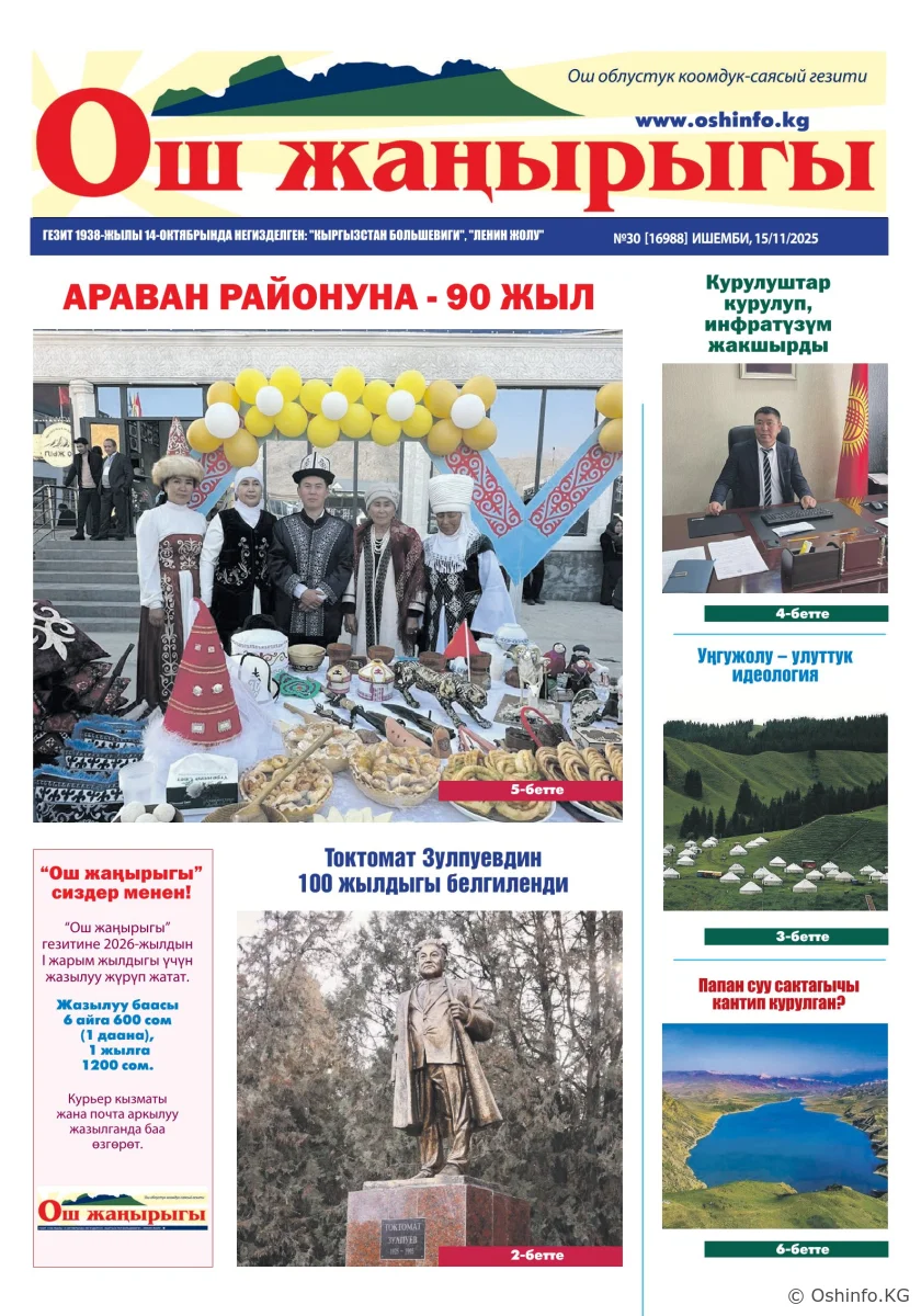 "Ош жаңырыгы" гезитинин 2025-жылдын 15-ноябрында чыккан №30 саны
