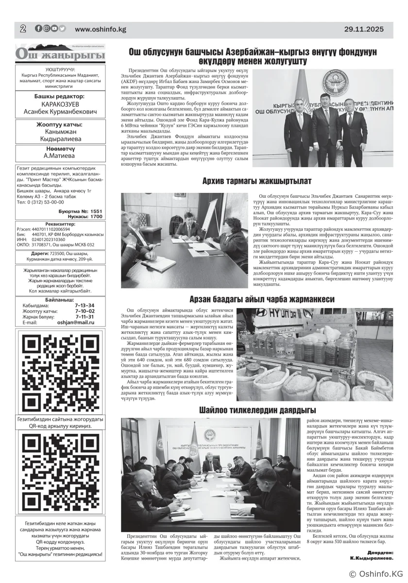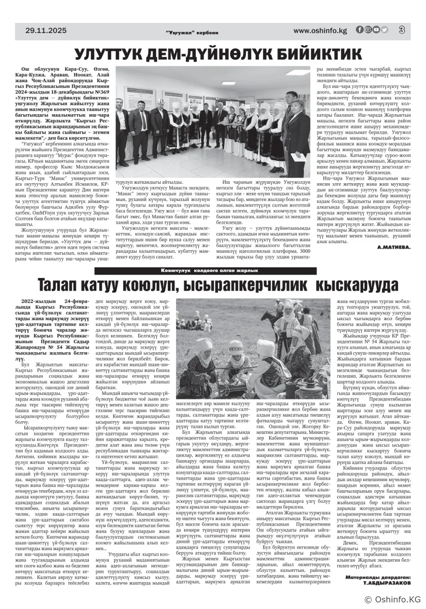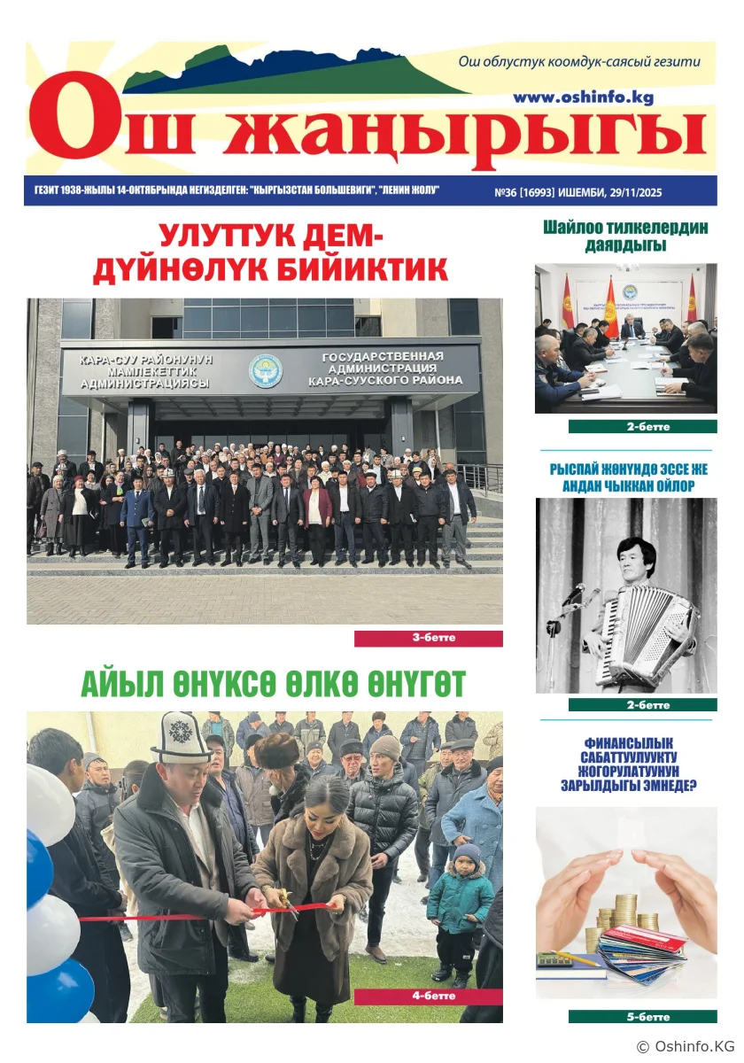 "Ош жаңырыгы" гезитинин 2025-жылдын 29-ноябрында чыккан №36 саны