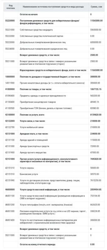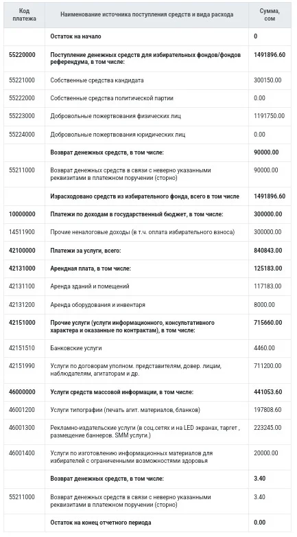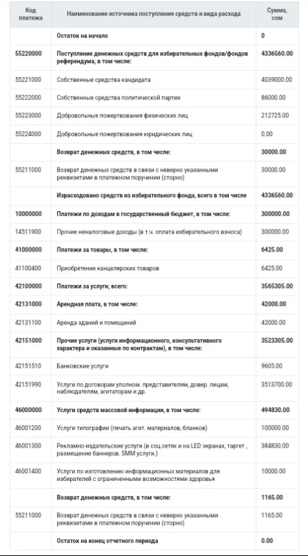 БШКнын маалыматына ылайык, аталган үч талапкердин жалпы шайлоо чыгымдары 17 млн 269 миң сомду түзгөн.