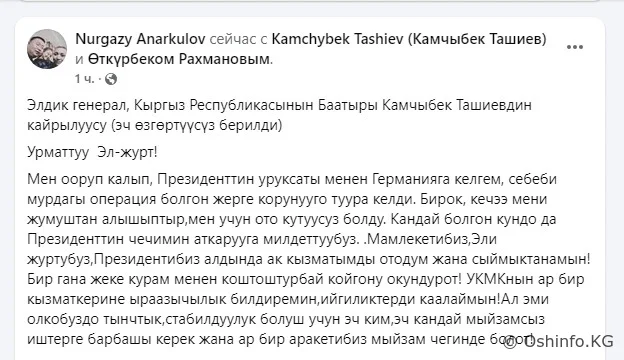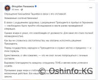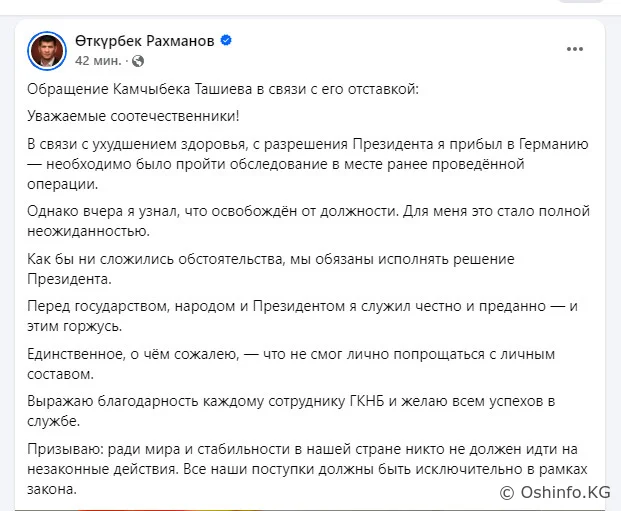 «Регион ТВ» телеканалы Министрлер кабинетинин төрагасынын мурдагы орун басары – УКМКнын төрагасы Камчыбек Ташиевдин кайрылуусунун текстин жарыялады. Мындан тышкары, бул текстти анын бир катар тарапташтары социалдык тармактарда да бөлүшүштү.