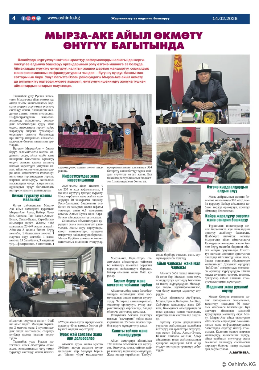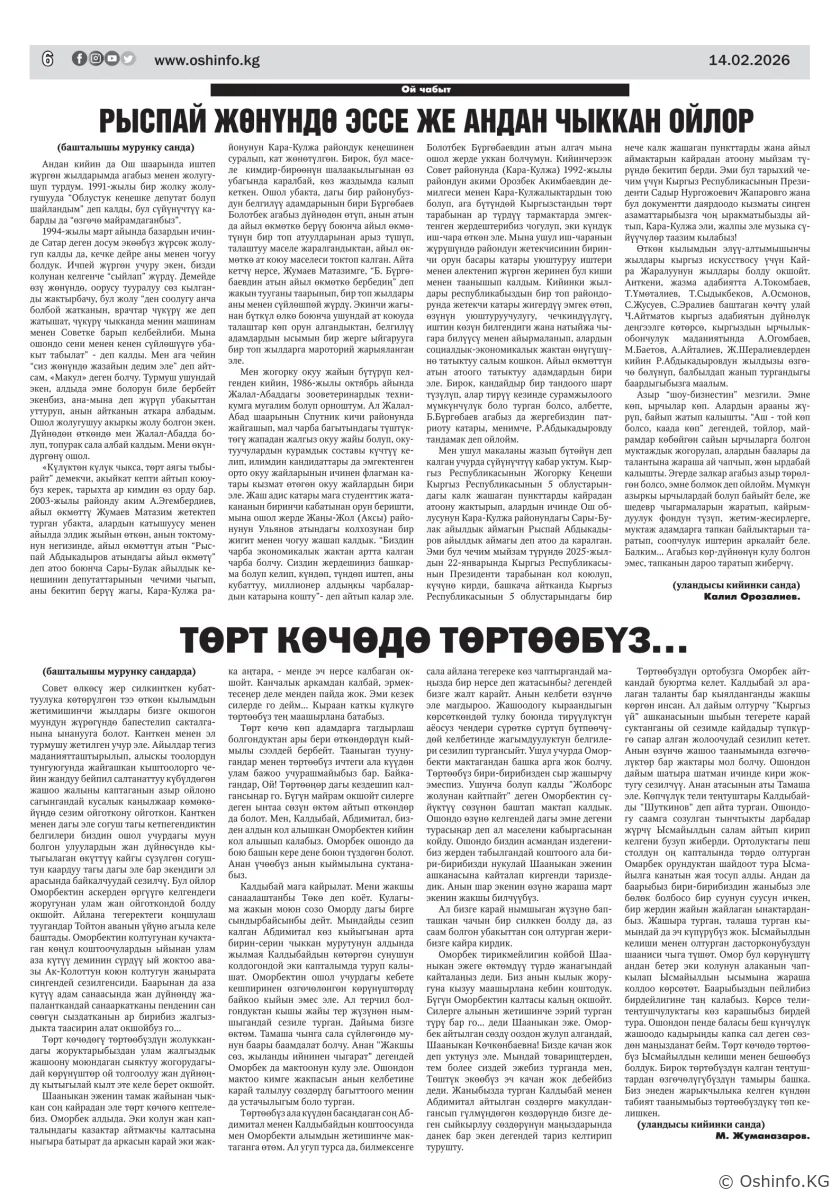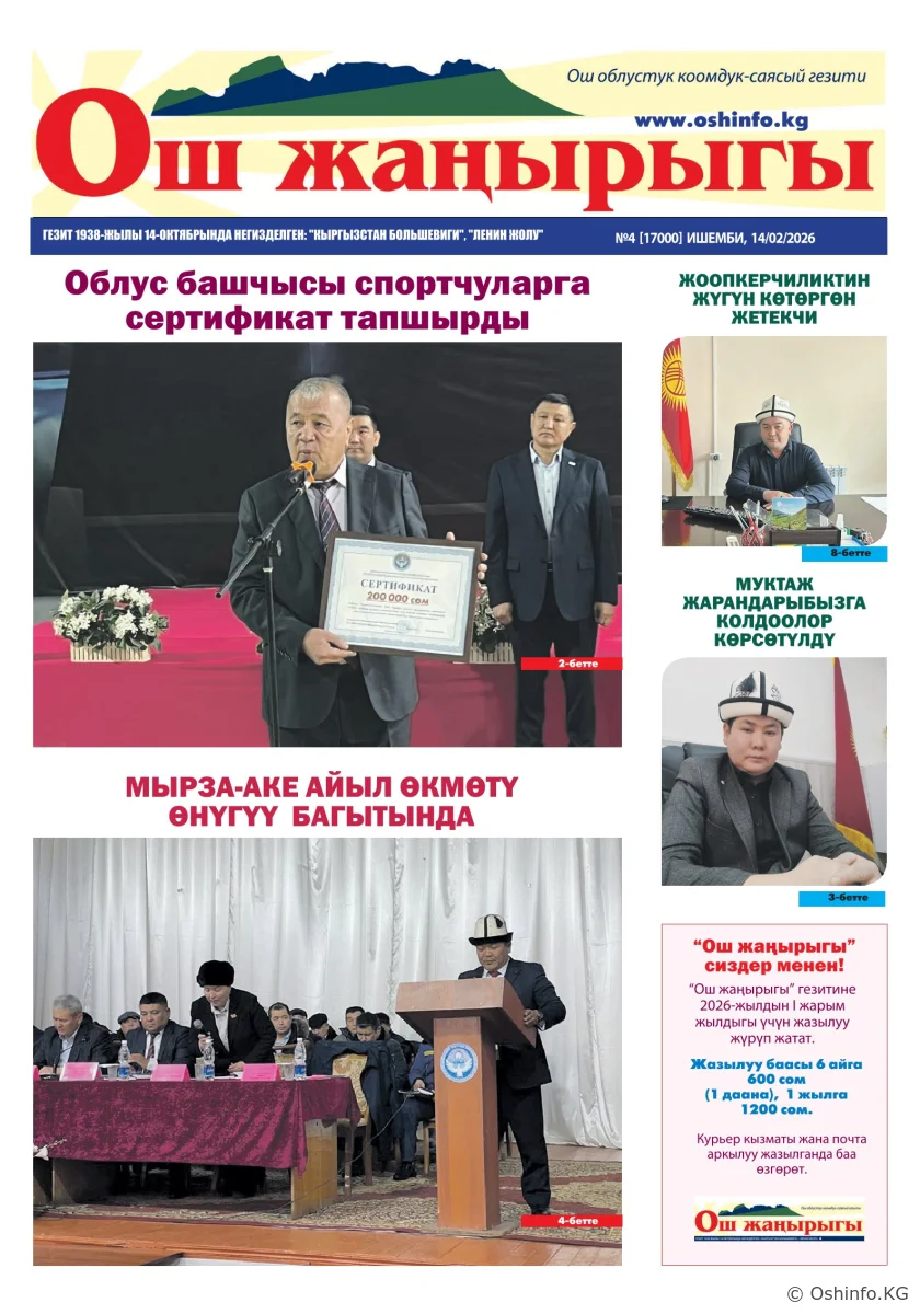 "Ош жаңырыгы" гезитинин 2026-жылдын 14-февралында чыккан №4 саны