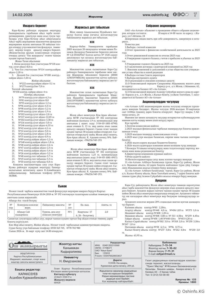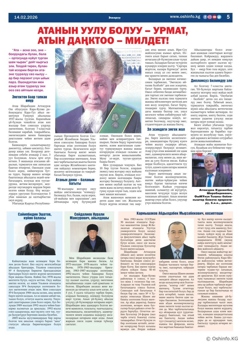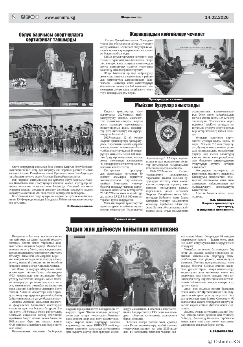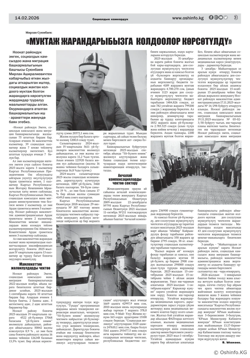 "Ош жаңырыгы" гезитинин 2026-жылдын 14-февралында чыккан №4 саны