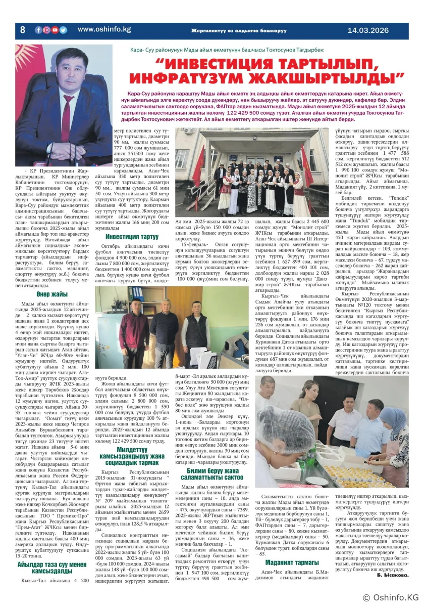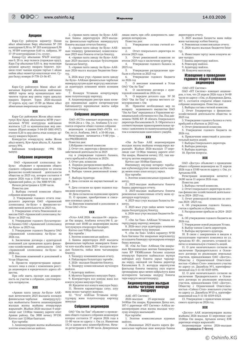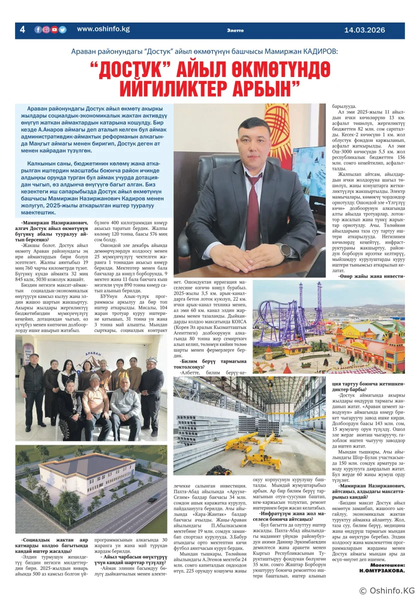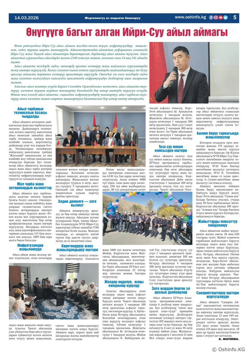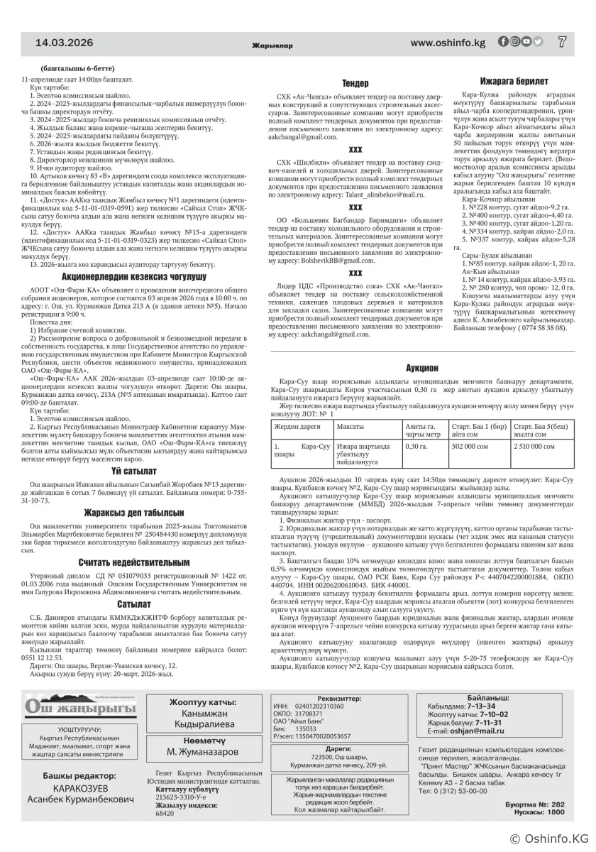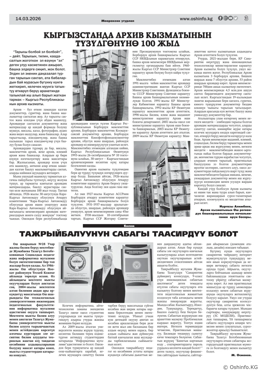 "Ош жаңырыгы" гезитинин 2026-жылдын 14-мартында чыккан №7 саны