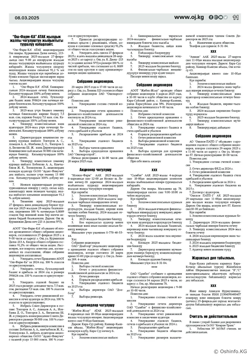 "Ош жаңырыгы" гезитинин 2025-жылдын 8-мартында чыккан №5 саны