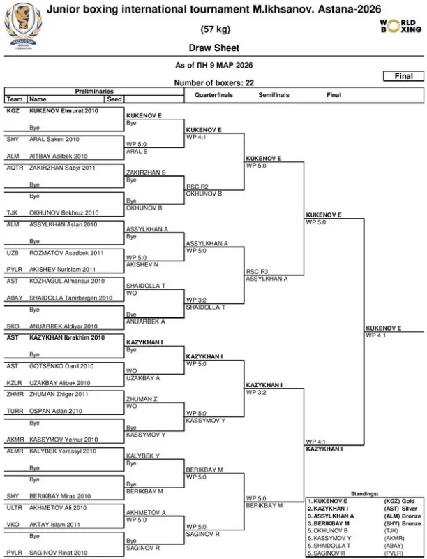 Кукенов 57 кг салмак категориясында күч сынашты. Бул категорияда Казакстан, Кыргызстан, Тажикстан жана Өзбекстандан жалпысынан 22 спортчу катышкан.