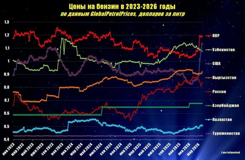 Түркмөнстанда, Казакстанда жана Азербайжанда баалар салыштырмалуу туруктуу бойдон калууда. Бул мамлекеттик жөнгө салуу же күйүүчү майды ички өндүрүштүн жогорку деңгээли менен түшүндүрүлөт. Кыргызстанда 2023-жылдан бери баалар олуттуу өсүп, болжол менен 0,9 доллар деңгээлинде турукташкан. Орусияда болсо 2025-жылдын ортосунан тарта баалардын өсүү тенденциясы даана байкала баштаган.